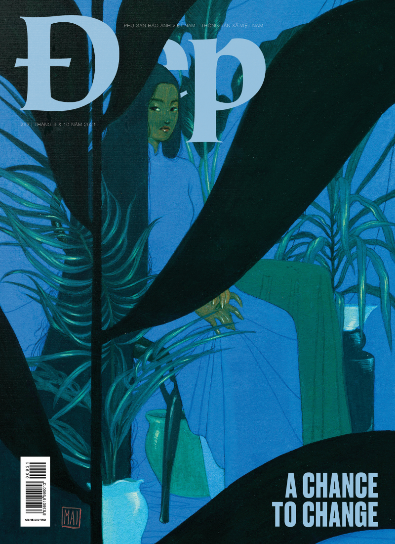 Vậy nhưng nếu không phải người, ai sẽ lên bìa đây? Tâm trạng chung của chúng ta sẽ lên bìa. Để lột tả điều này, Đẹp tìm đến Mai Tạ – một họa sĩ trẻ từng trung thực diễn giải những xúc cảm phức tạp mà bản thân cảm thấy ngay từ giai đoạn đầu đại dịch – thông qua bức tranh “I forgot to ask you if it was safe to come out”. Hình ảnh cô gái bị những tán cây sum suê buồn giam hãm, trong tà áo dài tệp cùng gam xanh khắc khoải, u uẩn như nói lên chính tâm thế thời đại lúc bấy giờ. Tuy nhiên, ánh nhìn tỉnh táo và kiên định đến kinh ngạc của chủ thể mới là điều thôi thúc Đẹp “phá lệ” vốn có để lựa chọn tác phẩm này làm trang bìa. Bởi như người chấp nhận thực tại nhưng chưa khi nào thôi mong chờ ngày có thể bước ra khỏi bóng lá dày kia, niềm tin về một tương lai “bình thường mới” trong chúng ta chắc chắn còn mạnh mẽ hơn tất thảy.