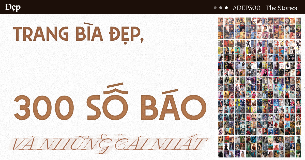 300 trang bìa. 300 concept. 300 câu chuyện. Trải dài ba thập kỷ và tất cả đều không trùng lặp. Vậy đâu là những “cái nhất” trong lịch sử trang bìa đồ sộ của Tạp chí Đẹp? Ngược dòng thời gian để tìm câu trả lời, ngay chính Đẹp cũng không khỏi trầm trồ trước những bất ngờ hết sức thú vị chứa đựng trong 300 mảnh ký ức tuyệt đẹp này.