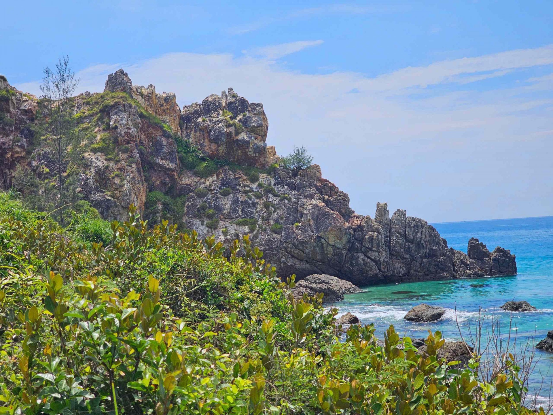 Với những ai mê khung hình đẹp, hãy tìm đến khu vực Mũi Vi Rồng, nơi những mỏm đá chênh vênh hướng thẳng ra biển lớn, bọt sóng trắng xóa dưới chân như một vệt lụa sống động. Cảnh quan hùng vĩ và hoang sơ tại đây sẽ mang đến cho bạn những bức ảnh độc đáo, ấn tượng. Ánh nắng vàng như mật ong trải dài trên mặt biển, phản chiếu lấp lánh trên từng phiến đá, tạo nên một khung cảnh kỳ ảo, mời gọi bạn ghi lại khoảnh khắc tuyệt vời này.