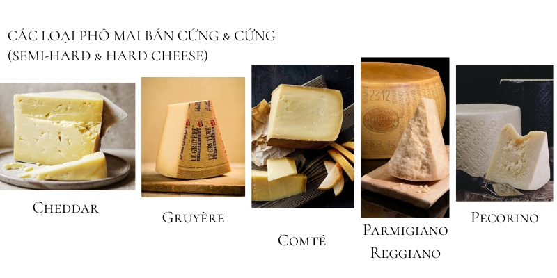 Phô mai bán cứng và phô mai cứng như Cheddar, Gruyère hay Comté có hương vị đậm đà hơn, giúp tạo chiều sâu và điểm tựa cho tổng thể. Nhóm này hợp với hạt rang, mật ong hoặc mứt trái cây.