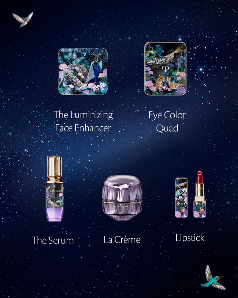 Lấy cảm hứng từ hành trình của niềm tin và sự tự khám phá, bộ sưu tập giới hạn này mở ra một thế giới viễn tưởng rực rỡ, nơi vẻ đẹp không chỉ đến từ bề ngoài, mà còn từ năng lượng nội tâm được soi sáng. Họa sĩ minh họa người Pháp Stéphane Kiehl đã cùng Clé de Peau Beauté vẽ nên thế giới huyền ảo ấy. Trên từng bao bì là hình ảnh của chuyến tàu ánh sáng, những linh vật mang phép màu như chim ruồi, bọ rùa ruby, khổng tước, báo hoa mai, linh dương và hươu trắng.