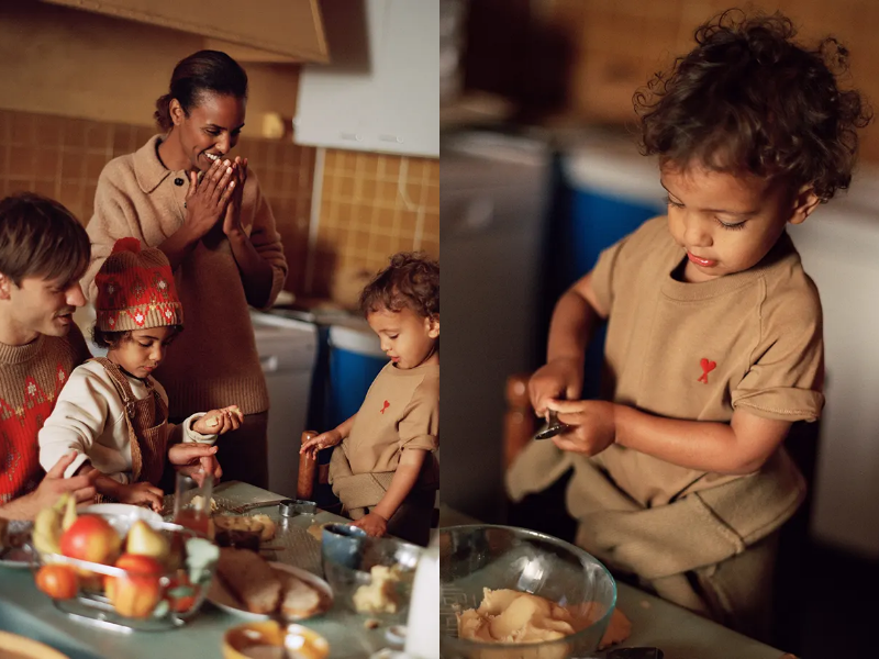 Ami Paris lần đầu giới thiệu các thiết kế dành cho trẻ em, chuyển tải các yếu tố cốt lõi của thương hiệu vào những sản phẩm dệt kim và jersey dành cho lứa tuổi nhỏ. Qua đó, các gia đình có thể chia sẻ cùng một ngôn ngữ thời trang, nối liền nhiều thế hệ. Bộ sưu tập bao gồm đồ dệt kim, áo khoác ngoài, các thiết kế may đo thiết yếu và phụ kiện mùa đông với kết cấu mềm mại. Chất liệu được lựa chọn nhằm tối đa hóa sự thoải mái, đồng thời vẫn giữ được đường nét gọn gàng và tinh tế đặc trưng của Ami Paris. Đặc biệt, những bức phác thảo ngẫu hứng của trẻ em xuất hiện trên tường nhà như một điểm nhấn hồn nhiên, phản ánh tinh thần vui tươi và chân thành mà thương hiệu luôn theo đuổi.