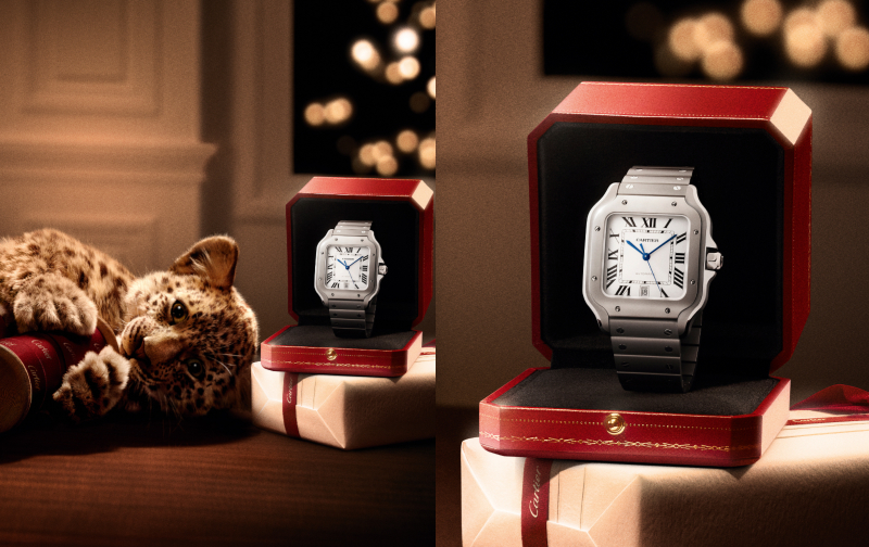 Santos de Cartier ra đời năm 1904 là một trong những chiếc đồng hồ đeo tay đầu tiên được thiết kế dành riêng cho nam giới. Đây là thành quả của tình bạn giữa nhà chế tác Louis Cartier và phi công Alberto Santos-Dumont. Santos-Dumont đã bày tỏ sự bất tiện khi sử dụng đồng hồ bỏ túi trong chuyến bay. Louis Cartier đã đáp lại bằng một chiếc đồng hồ đeo tay phẳng, hình vuông. Thiết kế mặt vuông này được lấy cảm hứng từ cấu trúc hình học của tháp Eiffel. Đặc biệt, dòng Santos LM Titanium gây ấn tượng khi sở hữu kích thước lớn, cùng dây đeo titanium. Mặt đồng hồ hình vuông được cố định bằng các vít trên vành bezel, phản ánh sức mạnh công nghiệp và sự tiến bộ công nghệ thời bấy giờ. Các phiên bản Santos hiện đại còn được trang bị hệ thống dây đeo QuickSwitch, cho phép người dùng hoán đổi dây đeo dễ dàng.