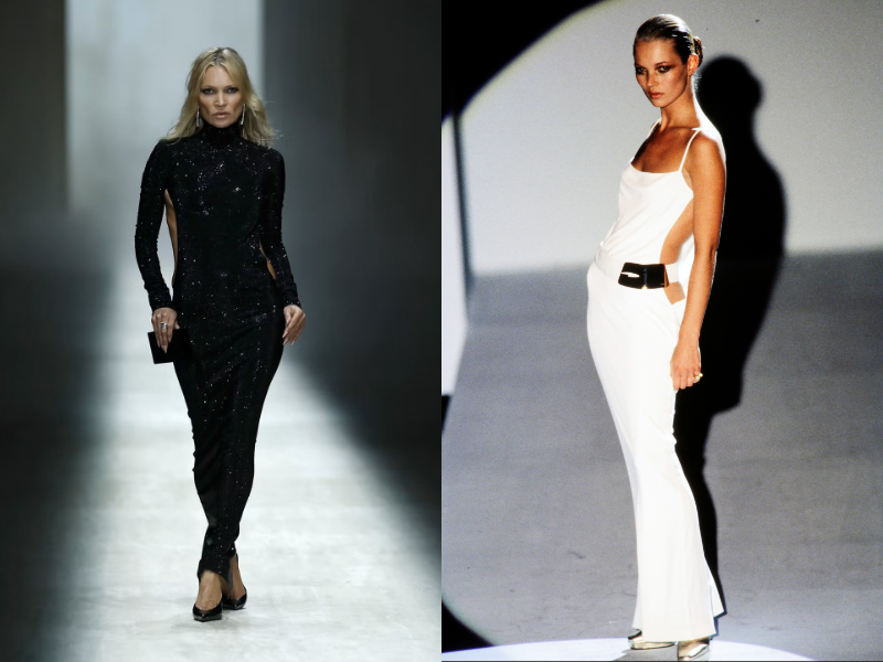 Ngay từ bộ sưu tập Thu Đông đầu tiên của Gucci, bên cạnh công trình khảo cứu về tính nguyên mẫu, về bản sắc đa dạng DNA nhà mốt, show diễn “Primavera” của Demna còn tạo nên một dấu ấn khác trở thành tâm điểm của Milan. Đó là khoảnh khắc Kate Moss bước trên sàn diễn của Gucci sau ba thập kỷ. Chiếc đầm đen hở lưng sâu, phần logo lấp lánh và dáng điềm tĩnh quen thuộc của Moss ngay lập tức gợi lại tinh thần gợi cảm từng gắn với kỷ nguyên Tom Ford tại Gucci cuối thập niên 90. The Cut gọi đây là một khoảnh khắc “nostalgia trigger” – một hình ảnh vừa mới mẻ vừa mang theo ký ức của cả một thời kỳ trong thời trang.