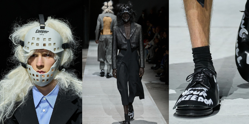 Đặc biệt, sàn diễn của Comme des Garçons Homme Plus bỗng hóa sân khấu của một vở chính kịch “Black Hole”, do Rei Kawakubo làm đạo diễn. Ở đó, người mẫu xuất hiện với những chiếc mặc nạ như bị phá vỡ, khoác lên các trang phục mang tinh thần phảng kháng đặc trưng của Kawakubo: blazer bị cắt xẻ để lộ eo, loe nhẹ phía trên thắt lưng, nở rộ với bèo nhún hoặc ghép mảng sequin đen; một số áo khoác bị cắt ngắn để lộ mảng bụng người mặc. Đâu đó, những bộ suit gắn chi tiết hoa lá phủ lên tunic và váy lông nguyên sơ xuất hiện, cùng manh mối hiếm hoi về ý đồ của Kawakubo là dòng chữ được vẽ trên đôi giày derby da: “Wear Your Freedom” (tạm dịch: Hãy khoác lên sự tự do của bạn).