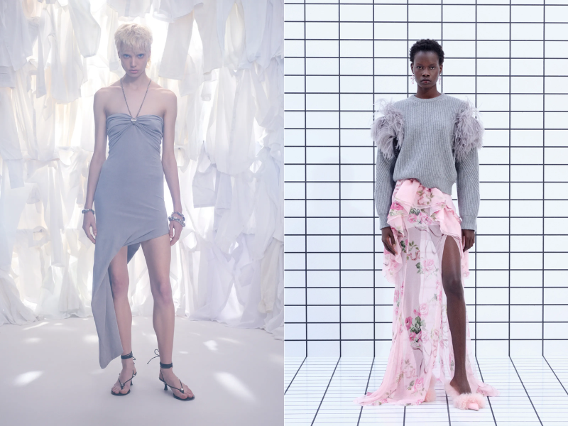 Từng là chi tiết phụ mang tính trang trí, những đường xẻ tà nay đã vươn lên trở thành tuyên ngôn phong cách chủ đạo cho mùa chớm thu 2025. Đúng như một cú “lách luật” đầy khéo léo của thời trang, tà váy, vạt áo không còn khép kín theo chuẩn mực cổ điển, mà được chủ ý mở bung, hé lộ vừa đủ – một lớp váy satin mượt mà, đôi chân thon lẩn khuất sau lớp vải mỏng, hay những chiếc quần tất màu khói gợi cảm như một cái nhìn ngập ngừng. Saint Laurent tiếp tục khẳng định tinh thần quyến rũ táo bạo qua những thiết kế chớm thu mới nhất. Một chiếc chân váy bút chì, tưởng như kín đáo, lại được “giải phóng” bằng một đường xẻ cao bất ngờ, mang lại hiệu ứng thị giác đầy mê hoặc: đôi chân được phô bày khéo léo, tỷ lệ cơ thể như được kéo dài ra theo từng bước di chuyển. Không cần nhờ cậy đến pha lê lấp lánh hay bảng màu ồn ào, chỉ một vạt vải chuyển động theo nhịp chân cũng đủ khiến người mặc chiếm trọn mọi ánh nhìn.