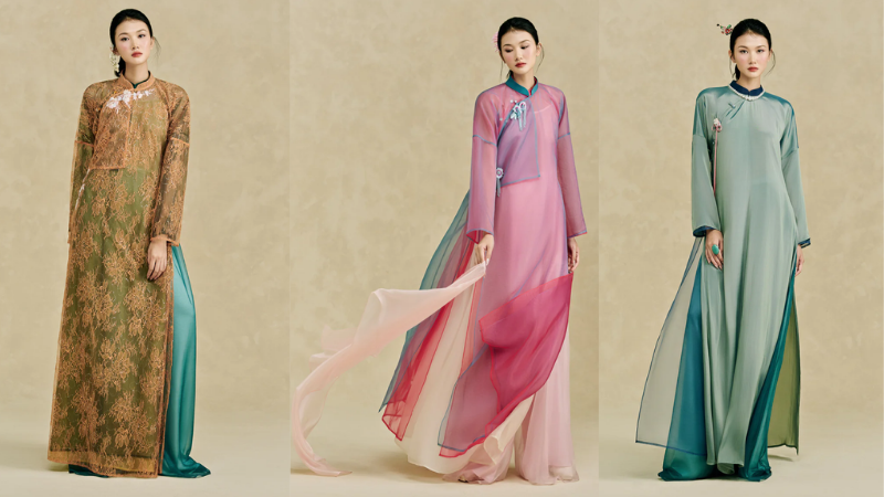 MARE định hình bộ sưu tập áo dài Tết 2026 như một chuỗi biến tấu trên nền phom dáng truyền thống. Các thiết kế khai thác dáng áo xưa với cổ cao, tay dài và tà thẳng, nhưng được điều chỉnh tỷ lệ để tạo độ rủ và độ thoáng khi di chuyển. Đường chiết eo được xử lý mềm hay phom suông buông nhẹ, cùng những biến thể tà tứ thân được tái cấu trúc để tăng tính linh hoạt trong cách mặc và phối lớp. Chất liệu được sử dụng đa dạng, từ lụa mỏng, nhung the, ren dệt nổi đến organza ánh mờ được xếp lớp khéo léo. Không có nhiều họa tiết cầu kỳ, tổng thể tập trung vào kỹ thuật dựng phom, nếp gấp và chuyển động tà áo, hướng đến cách tiếp cận áo dài như một cấu trúc thị giác cân bằng giữa cổ điển và hiện đại.
