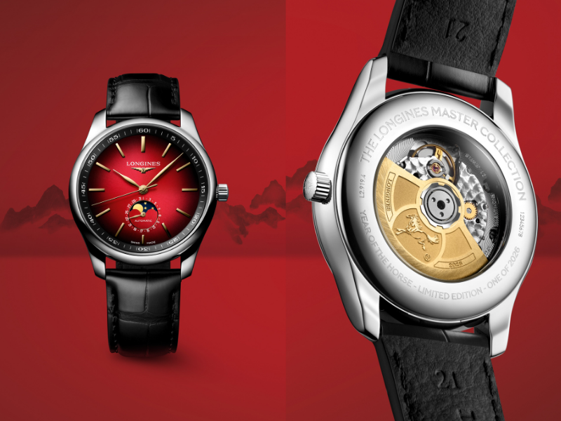 Tiếp nối Master Collection Year of the Dragon và Conquest Year of the Snake, phiên bản Master Collection Year of the Horse 2026 không đặt hình tượng con giáp trực tiếp trên mặt số. Thay vào đó, mẫu đồng hồ sử dụng mặt số đỏ trầm hoàn thiện chải tia, với hiệu ứng chuyển sắc đậm dần về viền. Trong văn hóa Trung Hoa, sắc đỏ gắn với vận may, niềm vui, sự sung túc và ý niệm bảo hộ. Khi được kết hợp cùng sắc vàng – một cặp đôi mang ý nghĩa cát tường cao hơn trong truyền thống Á Đông – bảng màu này tạo nên lớp ngôn ngữ biểu trưng rõ ràng. Vì lẽ đó, mặt số được hoàn thiện bằng các chi tiết mạ vàng: cọc số nổi, hệ thống vạch chỉ giờ, logo cánh chim Longines và bộ kim giờ – phút tạo hình chiếc lá. Cách thể hiện này giữ nguyên mạch thẩm mỹ quen thuộc của bộ sưu tập, trong khi thang phút vẫn được bố trí trên vành nghiêng, như ở các phiên bản tiền nhiệm.