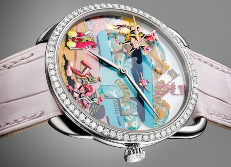 Tinh thần phá cách, ngôn ngữ pop-art và di sản gắn với ngựa của nhà mốt Paris giao thoa trong sáng tác vàng trắng 38 mm này, lấy cảm hứng từ thiết kế khăn lụa Locomotion của nghệ sĩ Pháp Ugo Bienvenu. Bộ vỏ được đính 71 viên kim cương, kết hợp núm chỉnh giờ gắn kim cương cắt giác rose, tạo khung cho mặt số được xử lý bằng kỹ thuật tiểu họa nhiều lớp – không chỉ trên nền mặt số mà còn ở mặt dưới của lớp kính sapphire. Các gam hồng, vàng, xanh lam và xanh lục được triển khai theo bố cục nhiều tầng, hình thành một dạng diorama thị giác, gợi nhắc không gian cửa hàng Hermès trên phố Faubourg Saint-Honoré. Mẫu đồng hồ vận hành bằng bộ máy tự động H1912 do Hermès phát triển, với mức trữ cót 50 giờ.