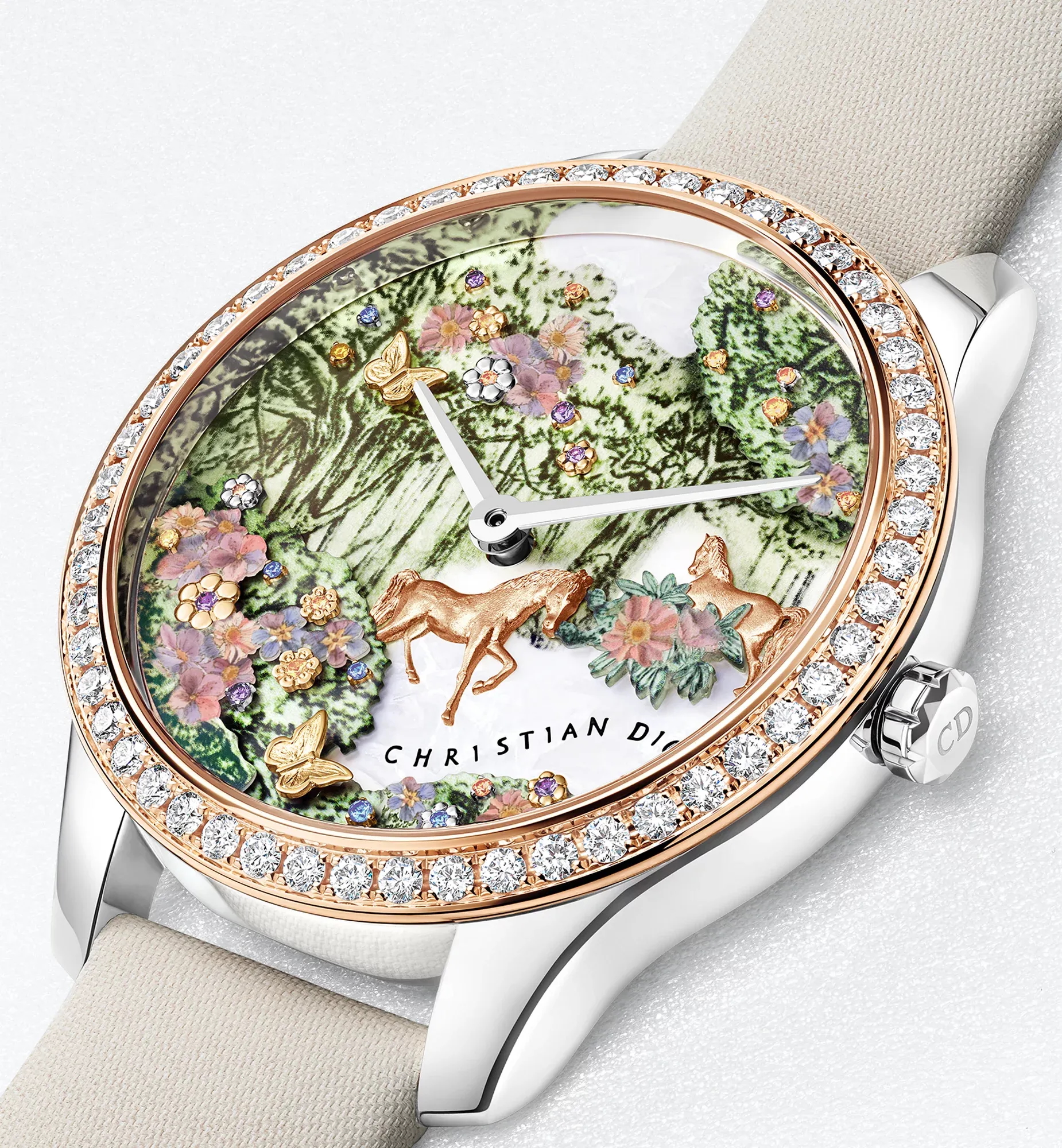 Tại Dior, hình ảnh khu vườn tưởng tượng và những cánh rừng mang sắc thái huyền ảo luôn xuất hiện như một mạch chủ đề xuyên suốt. Nhân dịp Năm Ngọ, nhà mốt đã kiến tạo một khung cảnh toile de Jouy thu nhỏ, nơi đôi ngựa bằng vàng hồng được tạo hình thủ công di chuyển giữa những tán cây khảm xà cừ, khu rừng hoa in họa tiết và các đóa hoa nạm thạch anh tím, spessartite và sapphire. Bố cục này tái hiện cách Dior chuyển hóa di sản họa tiết thành không gian trang sức, nơi thiên nhiên, kỹ nghệ và biểu tượng văn hóa cùng tồn tại trong một cấu trúc thị giác mãn nhãn. Thời gian được thể hiện qua bộ kim Dauphine bằng vàng hồng, đồng điệu với logo Christian Dior cùng sắc độ. Phần kỹ thuật của thiết kế dựa trên bộ máy tự động Sellita SW300 calibre, cung cấp mức trữ cót 42 giờ. Mặt đáy bằng sapphire mờ bán trong cho phép quan sát chuyển động cơ học bên trong, với lớp phủ kim loại vàng hồng đóng vai trò như điểm nhấn hoàn thiện.