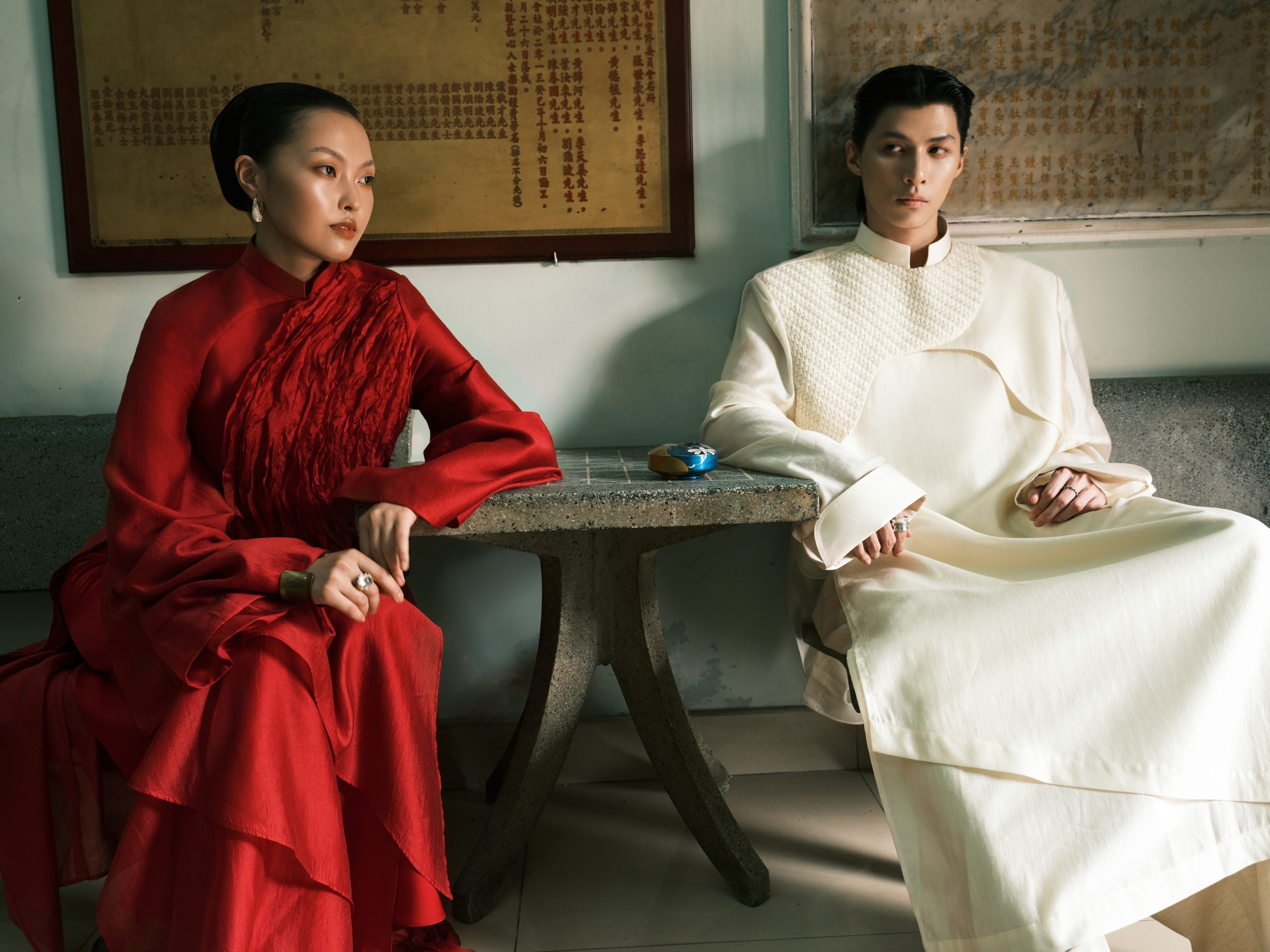 Vốn gắn liền với ký ức dân gian, nàng Tô Thị từ lâu được nhắc đến như biểu tượng của sự thuỷ chung và bền bỉ. Cũng bởi thế, tám thiết kế của bộ sưu tập, dành cả cho nam và nữ trở thành một nhịp cầu kết nối giữa truyền thống và hiện bằng cách xử lý phom dáng cũng như chất liệu tinh tế. Với áo dài nữ, vẻ đẹp hiện lên qua sự mềm mại có cấu trúc, thông qua tà dài, phom rũ, kín đáo. Trong khi đó, tinh thần Tô Thị ở áo dài nam được chuyển hoá thành sự trầm tĩnh và chính trực ở phom dáng phóng khoáng, song vẫn giữ được độ chuẩn mực cùng kết cấu rõ ràng.