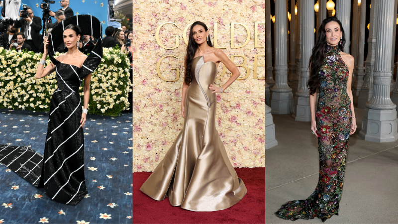 Năm 2025 đánh dấu sự “tái sinh hình ảnh” của Demi Moore, khẳng định cô không chỉ là diễn viên tài năng mà còn là biểu tượng thời trang đa chiều. Cô được tôn vinh là “Người phụ nữ đẹp nhất thế giới 2025” bởi People, ghi nhận vẻ đẹp tự nhiên, thần thái tự tin và cách cô đón nhận tuổi tác. Phong cách của Demi trong năm này thể hiện sự biến hóa mạnh mẽ, từ quyến rũ đến thời trang may đo cao cấp và những thiết kế Haute Couture táo bạo. Trên thảm đỏ, cô tạo dấu ấn với những lựa chọn mang tính tuyên ngôn như đầm bằng lụa xuyên thấu Gucci tinh xảo tại sự kiện Nghệ thuật & Điện ảnh LACMA thể hiện khía cạnh “nữ hoàng thảm đỏ” gợi cảm, trong khi thiết kế tiên phong, thử nghiệm của Thom Browne mô phỏng cà vạt nam tại triển lãm Met Gala 2025 được đánh giá là “xuất sắc nhất năm” nhờ sự sáng tạo và phá cách.