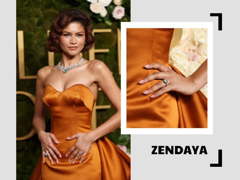 Tại thảm đỏ Quả cầu vàng 2025, bên cạnh bộ trang phục Louis Vuitton tông cam cháy, Zendaya thu hút ánh nhìn với chiếc nhẫn đính hôn do Tom Holland trao tặng. Thiết kế lấy cảm hứng từ phong cách Art Deco, nổi bật với viên kim cương hình lục giác, bao quanh bởi vòng hào quang tinh tế và đặt trên khung bạch kim tông màu lạnh. Điểm nhấn của nhẫn nằm ở cách đặt viên đá theo trục ngang đông – tây, hiếm thấy so với bố cục dọc truyền thống, giúp mở rộng cảm giác bề mặt và mang đến tổng thể diện mạo hiện đại.
