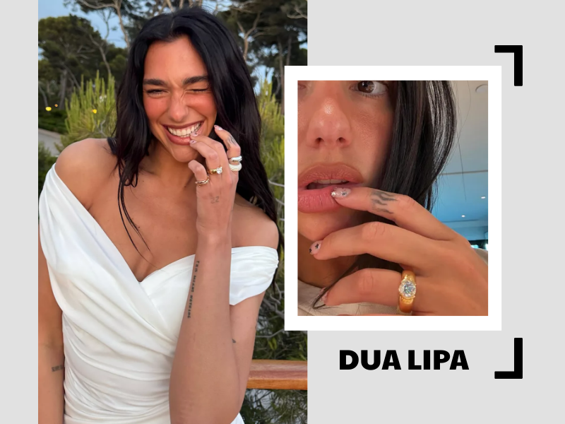 Khi Dua Lipa công bố đính hôn với Callum Turner đầu năm 2025, chiếc nhẫn trên tay cô nhanh chóng trở thành tâm điểm chú ý. Thiết kế sử dụng bản nhẫn vàng 18K rộng hơn nhiều so với các mẫu nhẫn cưới thông thường, giúp nổi bật dù vẫn giữ tinh thần tối giản. Trên nền kim loại bản lớn, viên kim cương tròn được đặt thấp, gần bằng bề mặt nhẫn, vừa giảm nguy cơ va chạm, vừa tạo cảm giác liền khối và hài hòa giữa kim loại và đá quý.