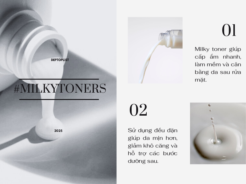 Điểm đặc biệt khiến milky toner trở nên nổi bật là khả năng kết hợp hai nhiệm vụ quan trọng cùng lúc: giữ ẩm sâu và củng cố hàng rào bảo vệ da. Nhờ kết cấu sữa mỏng mịn, nhóm sản phẩm này chứa nhiều thành phần dưỡng như ceramide, acid béo, hyaluronic acid hay panthenol – những chất giúp lấp đầy khoảng trống của lớp màng lipid, hỗ trợ da giữ nước tốt hơn và mang lại độ căng mọng tự nhiên mà các cô nàng luôn tìm kiếm.