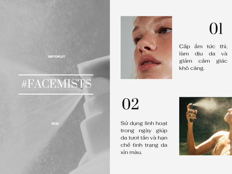 Nếu bạn yêu thích vẻ đẹp glass skin trong trẻo, thì chắc chắn không thể bỏ qua face mist – “vũ khí” giúp cố định độ căng bóng và giữ làn da luôn ngậm nước suốt cả ngày. Chỉ cần xịt nhẹ sau khi rửa mặt, giữa các bước skincare hoặc ngay trước khi makeup, lớp sương mỏng sẽ lập tức làm mềm da, làm đều độ ẩm và tạo độ glow tự nhiên như phủ một lớp ánh sáng mịn. Bạn cũng có thể mang theo trong túi và xịt lại bất cứ lúc nào da xuống tông, khô căng hoặc cần làm mới lớp makeup. Đều đặn sử dụng face mist chính là bí quyết để duy trì hiệu ứng da căng bóng, mềm ẩm.