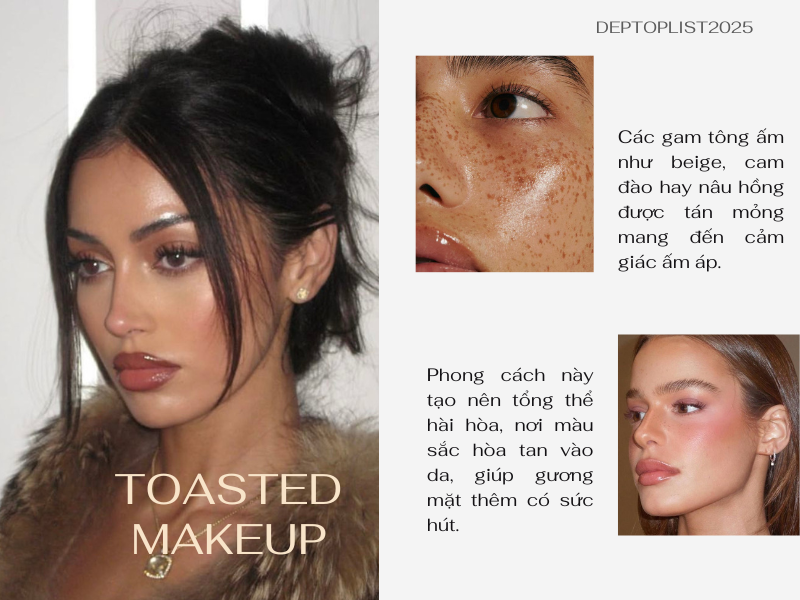 Năm 2025, “Toasted Makeup” trở thành một trong những xu hướng trang điểm được hưởng ứng rộng rãi nhờ tinh thần ấm áp, tự nhiên và dễ ứng dụng. Khác với lớp nền rám nắng vàng óng hay phong cách bronzed đậm chất mùa hè, kiểu trang điểm này mềm mại hơn, tập trung vào việc tôn lên vẻ rạng rỡ vốn có của làn da thay vì phủ thêm sắc màu lên gương mặt.