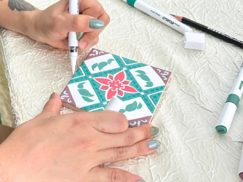 Trong hai giờ trải nghiệm, du khách sẽ được tìm hiểu nguồn gốc và ý nghĩa sâu sắc của hoa văn Peranakan, đồng thời khám phá kiến trúc shophouse đặc trưng của cộng đồng này. Dưới sự hướng dẫn tận tình của nghệ nhân, người tham gia sẽ thực hành phối hình học đối xứng, tạo đường viền nổi và vẽ họa tiết tinh xảo bằng bút lông, từ đó tự tay tạo nên viên gạch sứ mang đậm dấu ấn Peranakan.