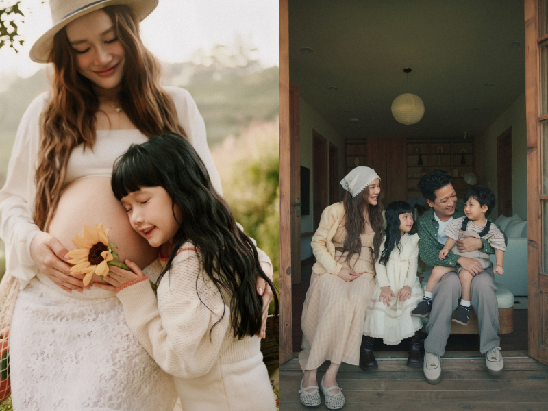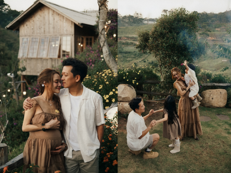 Qua lăng kính của nhiếp ảnh gia Mạnh Bi, vợ chồng Trường Giang – Nhã Phương cùng hai thiên thần nhỏ quây quần bên nhau, tận hưởng khoảng thời gian hạnh phúc trong khu vườn nhỏ phủ ngập sắc hoa. Dù bước vào tháng cuối của thai kỳ, Nhã Phương vẫn giữ sắc vóc khỏe khoắn và ngọt ngào.