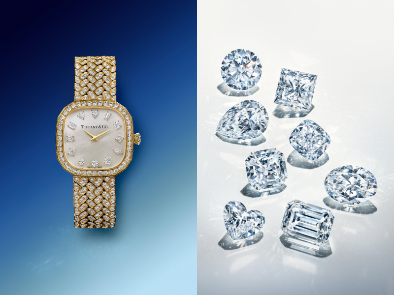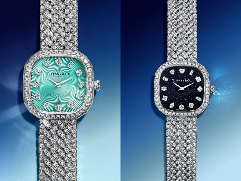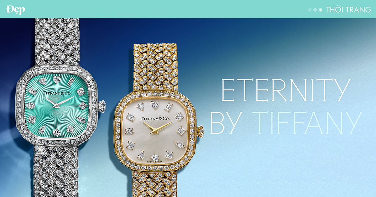 Minh chứng tinh tế cho trình độ chế tác (savoir-faire) vượt trội của Tiffany & Co., mẫu đồng hồ Eternity by Tiffany bằng vàng trắng 18k với dây đeo nạm kim cương toàn phần được đính 512 viên kim cương với tổng trọng lượng hơn 6 carat. Mặt số được chế tác từ đá aventurine, với 12 viên kim cương được đính thủ công để biểu thị các mốc giờ, mỗi viên mang một kiểu cắt độc đáo: round brilliant, baguette, cushion, Tiffany True®, marquise, Asscher, heart, pear, oval, emerald, triangle và princess.