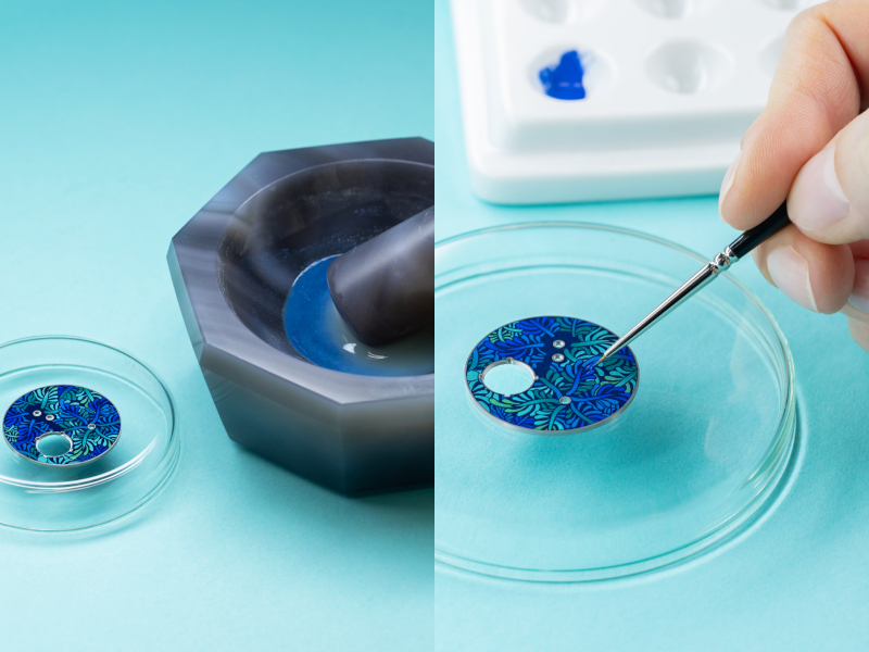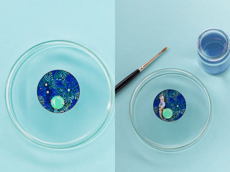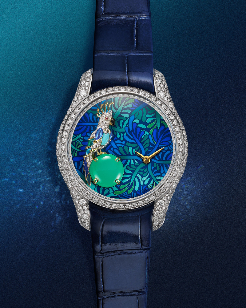 Những viên đá quý lộng lẫy, kỹ nghệ tráng men tinh xảo cùng nghệ thuật điêu khắc vàng và nạm đá đỉnh cao kết hợp để biến chiếc đồng hồ thành một bức tranh nhiệt đới thu nhỏ. Hòa quyện giữa vẻ đẹp tự nhiên và trí tưởng tượng, chú chim đính đá nhỏ xinh đậu trên viên đá cabochon rực rỡ như đang lơ lửng phía trên mặt số men lấy cảm hứng từ thiên nhiên. Mặt số được tạo nên từ 3 lớp men vẽ tay hình tán lá, đặt trên bốn lớp men xanh đục, đòi hỏi hơn 80 giờ chế tác chính xác cao.