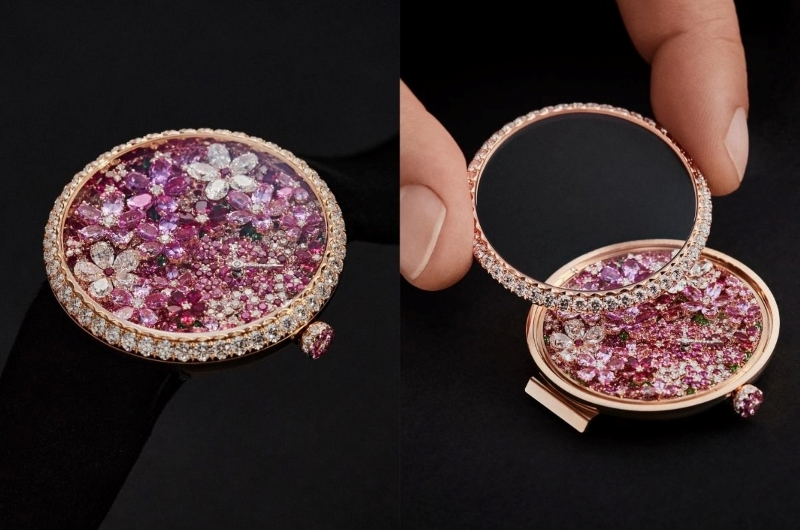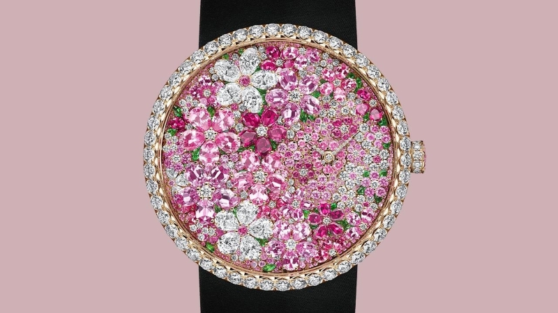 Lấy cảm hứng từ bộ sưu tập trang sức cao cấp Les Jardins de la Couture, La D de Dior Buisson Couture tiếp tục khám phá thế giới thiên nhiên đầy chất thơ của Victoire de Castellane. Thiết kế mô phỏng một khu vườn thu nhỏ, với những tràng hoa nở rộ bằng đá quý, gợi nhắc các đường thêu tinh xảo của Haute Couture. Bảng màu xanh lá – hồng được tạo nên từ kim cương, sapphire hồng và tsavorite, nạm trên nền vàng hồng, kết hợp nhiều kiểu cắt đá khác nhau để tái hiện độ sâu và chuyển sắc của cánh hoa cùng lá. Mặt số lệch tâm đặt tại vị trí 3 giờ giúp bố cục hoa đá quý trở thành tâm điểm, đồng thời giữ trọn tinh thần lãng mạn đặc trưng của Dior.