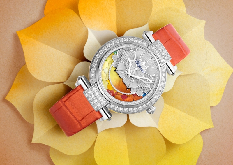 Imperiale Four Seasons mở ra chương mới cho bộ sưu tập biểu tượng của Chopard, lấy cảm hứng từ vòng tuần hoàn bốn mùa. Thiết kế đặt thời gian chuyển động liên tục làm trung tâm, với một đĩa xoay hoàn tất trong 365 ngày, tái hiện sắc thái xuân, hạ, thu, đông thông qua kỹ thuật ghép xà cừ sơn mài tinh vi. Mặt số được chia làm hai phần: nửa trên trang trí ren vàng trắng 18K khắc hình hoa sen, nửa dưới hé lộ lớp xà cừ chuyển sắc mô phỏng thiên nhiên.
