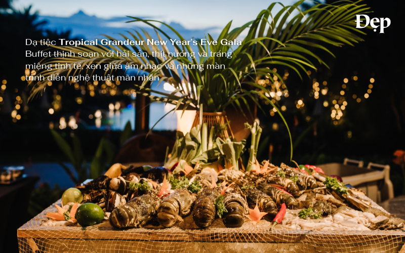 Đêm 31 tháng 12, cả khu vườn lộng lẫy trong tấm áo mới của ánh sáng lấp lánh, chào đón dạ tiệc Tropical Grandeur New Year’s Eve Gala. Buffet thịnh soạn với hải sản, thịt nướng và tráng miệng hoàn hảo được sắp đặt tinh tế, xen giữa là âm nhạc, những màn trình diễn nghệ thuật mãn nhãn và những tràng pháo tay vang lên không dứt. Những ly rượu ngon liên tục được rót đầy, câu chuyện vui vẻ bên bàn ăn kéo dài rôm rả, bầu không khí hân hoan và thân tình như ôm trọn cả đất trời và con người trên đảo Ngọc.