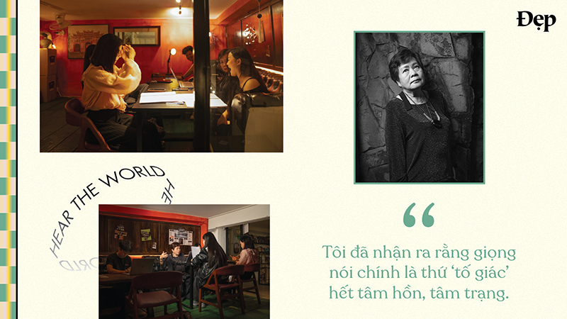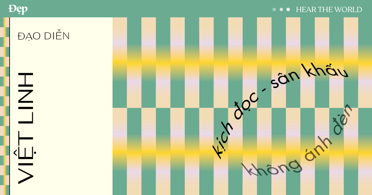 Đẹp mời bạn bước vào một chuyến đi âm thanh, cảm nhận thế giới theo cách khác. Cùng nhau, chúng ta tham dự một buổi diễn kịch đọc, nơi không có ánh đèn hay sân khấu vật lý, chỉ có giọng nói dẫn lối cho trí tưởng tượng; lắng nghe giai điệu trong trẻo của chiếc trống handpan và cảm nhận những cung bậc cảm xúc khác nhau; chơi đùa với tiếng sáo diều, tiếng gió, tiếng nước chảy… cùng các nghệ sĩ âm thanh.