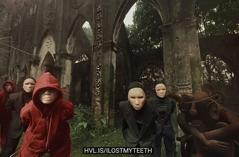 Đường dẫn tiếp theo tiếp tục được lồng ghép theo cách quen thuộc ở 1:57. Lần này, đường dẫn được khắc dọc trên thân một cột trụ, gần như tan vào bề mặt kiến trúc đã nhuốm màu thời gian. Cũng trong mạch không gian ấy, ở giây thứ 5 của phút thứ 2, một dòng phụ đề khác xuất hiện với dòng chữ “hvl.is/ilostmyteeth”, tiếp tục đẩy trải nghiệm người xem vào trạng thái mơ hồ khi thông điệp được đưa ra nhưng ý nghĩa vẫn hoàn toàn là ẩn số.