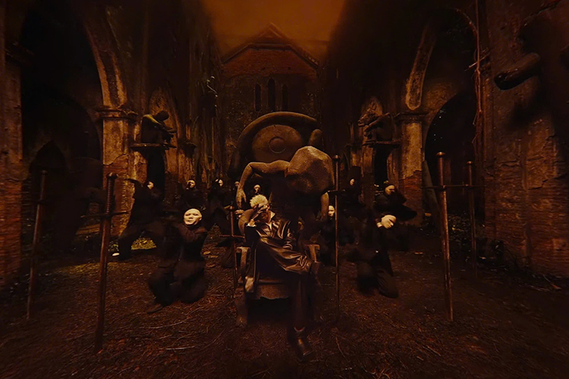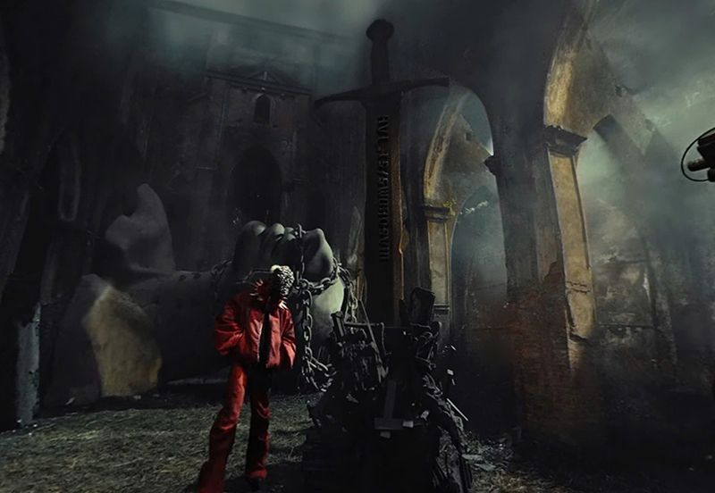 Ngay trong 15 giây đầu tiên, một thông điệp ẩn đã xuất hiện dưới dạng đường dẫn được khắc trực tiếp lên thân thanh kiếm, đặt dọc theo khung hình. Chi tiết này hiện lên giữa bối cảnh kiến trúc cổ kính với những vòm đá cao và ánh sáng mờ đục phủ khắp không gian. Trong không gian ấy, một nhân vật được tạo hình với khuôn mặt bị che phủ bởi lớp mặt nạ gai góc trong bộ trang phục tông đỏ trầm mang lại cảm giác nặng nề và bí ẩn. Đường dẫn gần như hoà vào chất liệu kim loại của thanh kiếm, khiến người xem dễ dàng bỏ lỡ nếu không dừng lại quan sát kỹ từng khung hình.