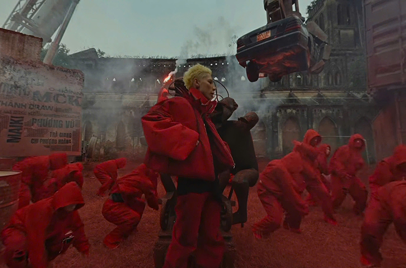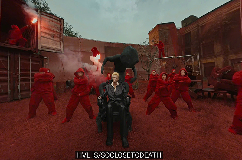 Tại mốc 1:06, đường dẫn tiếp tục xuất hiện theo hai cách khác nhau trong cùng một nhịp cắt. Một lần được lồng trực tiếp vào chi tiết biển số xe khi chiếc xe bị treo lơ lửng. Ngay sau đó, MCK xuất hiện, ngồi ở trung tâm khung hình, anh gần như tách khỏi toàn bộ chuyển động hỗn loạn phía sau, nơi những nhân vật trong trang phục đỏ liên tục chuyển động, gợi liên tưởng đến một trận chiến nhuốm màu máu. Sự đối lập giữa trạng thái tĩnh tại, ung dung và bối cảnh hỗn loạn, kết hợp với dòng chữ “hvl.is/soclosetodeath” xuất hiện như một phụ đề trên màn hình, tạo nên một cảm giác căng thẳng khó gọi tên, như thể nhân vật đang tiến rất gần đến một ranh giới mong manh nào đó.
