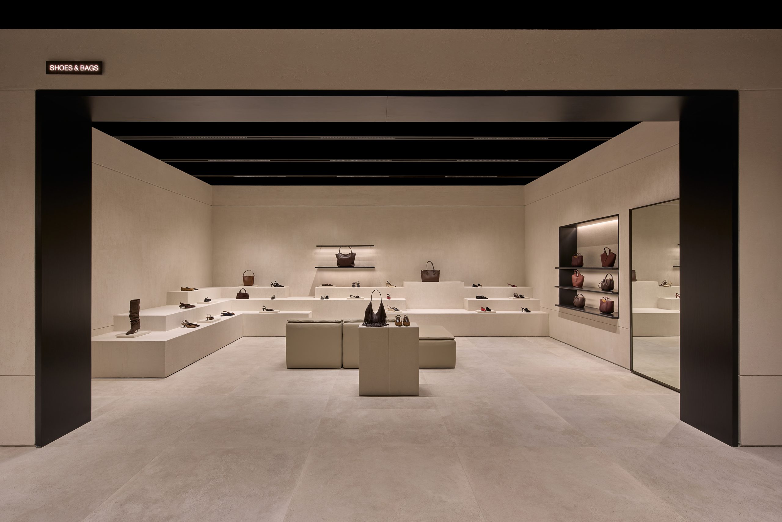 Khu vực thời trang nữ được bố trí tại tầng trệt với trần cao và vật liệu như gỗ sồi, bề mặt xử lý sẫm và kim loại sơn mài đen. Không gian tầng hầm dành cho dòng sản phẩm hướng đến nhóm khách hàng trẻ, sử dụng thép không gỉ, trần tối màu và kết cấu gợi nhắc ngôn ngữ công nghiệp để phân tách các khu trưng bày. Khu vực thời trang nam tiếp nối cùng nguyên lý kiến trúc, với bảng vật liệu xoay quanh các tông xám đậm và bề mặt đá cẩm thạch. Ở cả hai nơi, các khu vực bán hàng mở được đặt cạnh những phòng trưng bày, kết nối bằng hệ khung gỗ tối màu, đóng vai trò chuyển tiếp giữa các không gian.