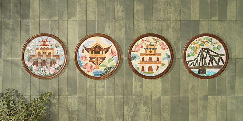 BST tranh gốm mosaic “Hà Nội Nhớ” gồm bốn tác phẩm, tương ứng với bốn địa danh biểu tượng của Hà Nội được chế tác trên nền sắc men gốm rực rỡ. Chạm vào từng bức tranh, cảm nhận sự kết hợp khéo léo và tinh tế giữa các dòng men truyền thống cùng những hình ảnh sống động, người xem như được dẫn dắt trở về một miền ký ức Hà Nội thân quen trong tâm trí: