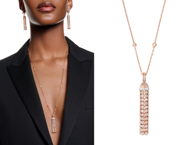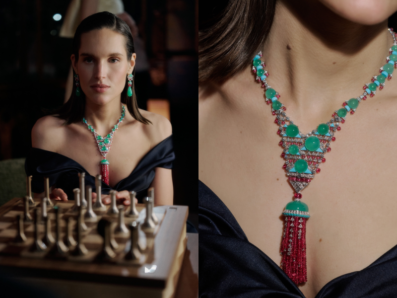 Ngoài ra, dải ruy băng vốn là một trong những chi tiết trang trí chủ đạo trong thời trang cũng tìm thấy tiếng nói trên chiếc vòng cổ Diorama của Dior. Được chế tác từ vàng trắng và kim cương, thiết kế uốn lượn với những đường xoắn nhẹ, tạo nên một nhịp điệu không hoàn toàn đều, như thể đang chuyển động theo một tiết tấu riêng. Mỗi chi tiết được hoàn thiện độc lập, rồi liên kết bằng những khớp nối ẩn, cho phép toàn bộ cấu trúc uyển chuyển theo từng cử động. Trên bề mặt đó, 229 viên kim cương được sắp đặt trong một trật tự chặt chẽ, với tổng trọng lượng 11,25 carat.