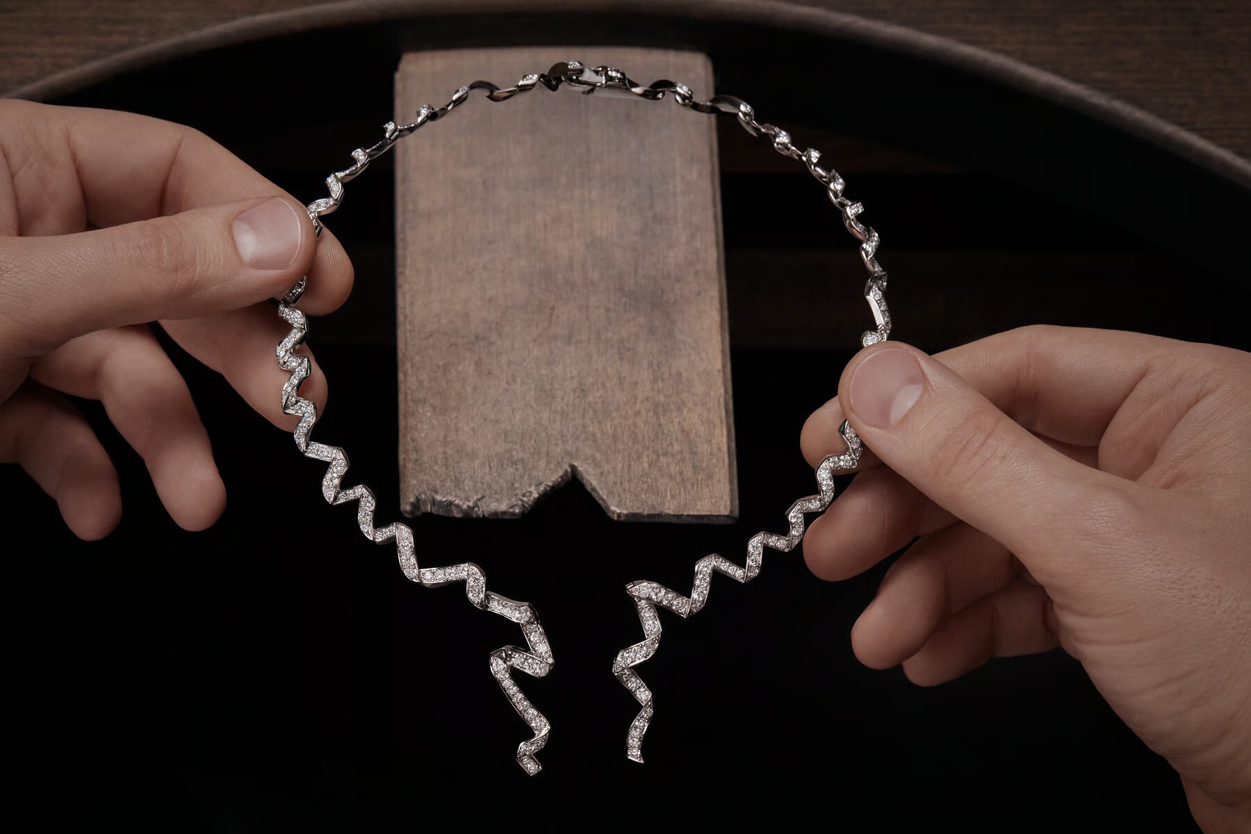 Thiết kế này giữ lại cơ chế đóng mở của khóa kéo thông qua hệ thống các răng khóa bằng vàng được sắp xếp liên tiếp cùng phần đầu kéo có thể trượt. Khi mở hoàn toàn, món trang sức hoạt động như một vòng cổ, và khi tháo phần phía sau, nó có thể chuyển đổi thành vòng tay. Cấu trúc này cho phép trang sức vận hành theo nguyên lý của trang phục, thay vì chỉ dừng lại ở việc mô phỏng hình ảnh. Bên cạnh cơ chế chuyển động, bề mặt của vòng cổ Zip còn gợi liên hệ với chất liệu dệt khi phần thân khóa được xử lý với cấu trúc lưới tương tự vải serge. Các chi tiết kim cương được bố trí dọc theo đường khóa, tạo một đường viền liên tục và rõ ràng.