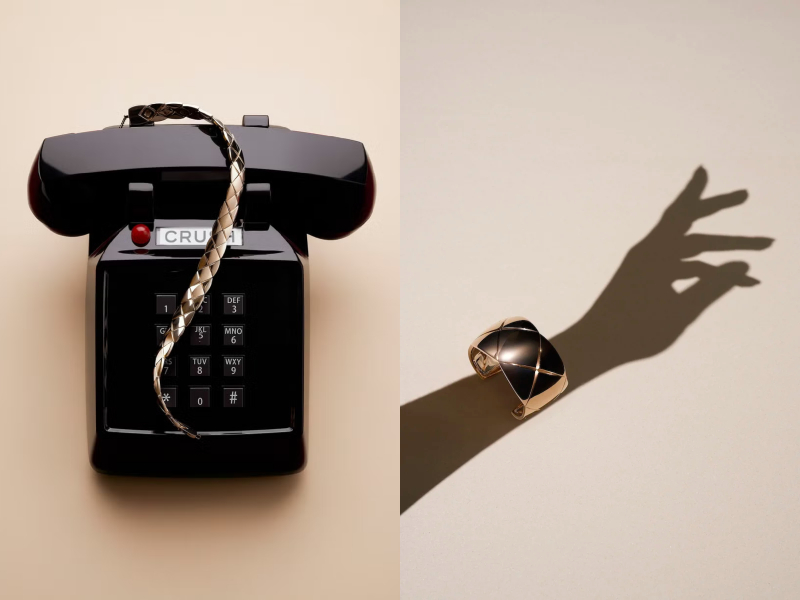 CHANEL là minh chứng rõ nét cho mối duyên bền bỉ với họa tiết may cần hình quả trám, một hệ thẩm mỹ được nuôi dưỡng qua thời gian từ thời nhà sáng lập Gabrielle Chanel. Năm 2015, dòng Coco Crush ra đời, dần trở thành một trong những bộ sưu tập khai niên được mong đợi của giới kim hoàn. Trên bề mặt vàng, các rãnh được khắc tỉ mỉ, đan cài thành cấu trúc hình học chuẩn xác, như một sự chuyển dịch thay thế cho những đường chỉ của kỹ thuật chần bông, nhưng vẫn giữ trọn tinh thần mềm mại và nhịp điệu của chất liệu vải. Các rãnh này đóng vai trò phân chia mặt phẳng vàng thành những ô hình học, đồng thời tạo nhịp điệu ánh sáng khi bề mặt phản chiếu theo nhiều hướng khác nhau.