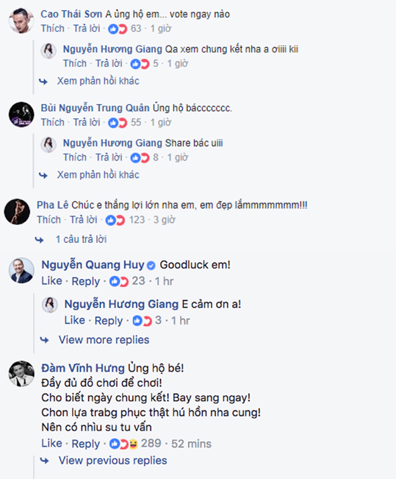 Nhà thiết kế Lê Ngọc Lâm: “Ấn tượng của Lâm về Hương Giang chính là Giang luôn thể hiện đúng tinh thần mỗi bộ trang phục mỗi khi mặc lên người. Thần thái tốt, sự thông minh toát ra khi trả lời phỏng vấn trước báo giới nước ngoài cùng vẻ đẹp hiện đại giúp Hương Giang lấn át các thí sinh khác. Cuộc thi năm nay là dành cho Hương Giang, Lâm tin Hương Giang sẽ lọt top 3 của cuộc thi, hi vọng sẽ đạt thứ hạng cao nhất”.