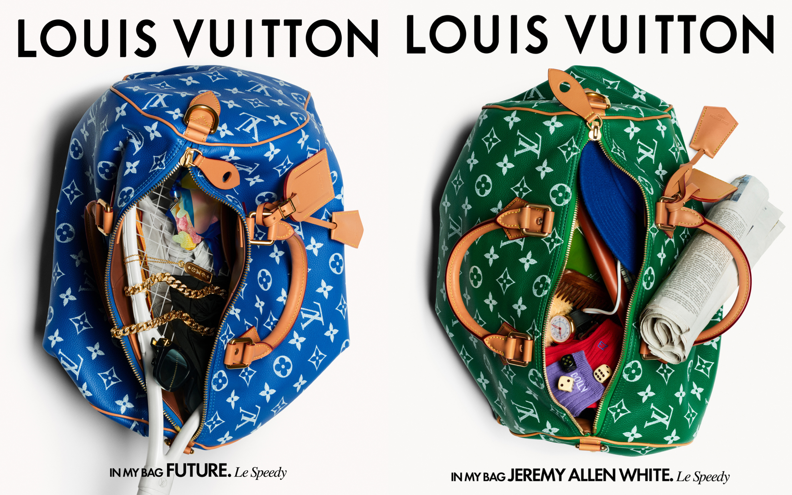 Trong khi đó, thế giới của nghệ sĩ Future được hé lộ qua những lựa chọn đầy ngẫu hứng: một cây vợt tennis, sợi dây chuyền vàng nạm kim cương, charm Monogram, kẹo dẻo và một đôi sneakers, tất cả nằm gọn trong chiếc Speedy P9 màu xanh dương. Hay chiếc túi Speedy P9 hồng của rapper Jackson Wang được điểm xuyết bằng cặp xúc xắc lông, mở ra thế giới đa sắc của người nghệ sĩ với tai nghe, bức ảnh Polaroid gia đình, găng tay đấu kiếm, bản ký âm, khối Rubik, một chiếc sneaker mini và nhiều hơn nữa.
