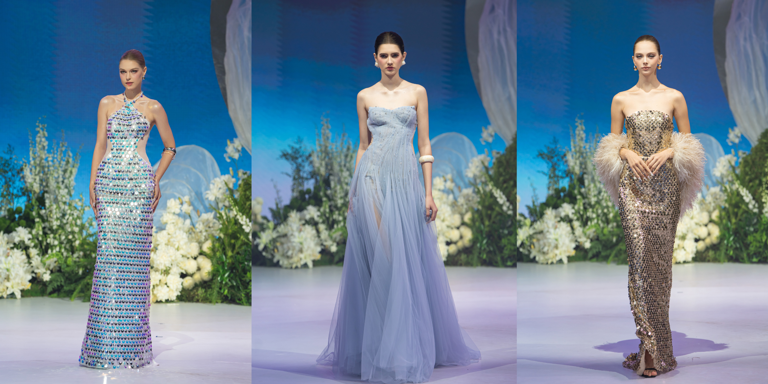 Điểm nhấn nghệ thuật nằm ở những chi tiết được chế tác thủ công tỉ mỉ: pha lê đính tay, sequin gương (mirror sequins), lông vũ applique… tất cả tạo nên hiệu ứng ánh sáng đa chiều, lung linh và huyền hoặc. Lớp phủ phản quang (mirror-reflective coating) cùng họa tiết thêu moonlight embroidery motif gợi nhắc đến vẻ đẹp mê hoặc của bầu trời đêm, khiến mỗi chiếc váy tựa như một “mảnh trăng” riêng biệt.