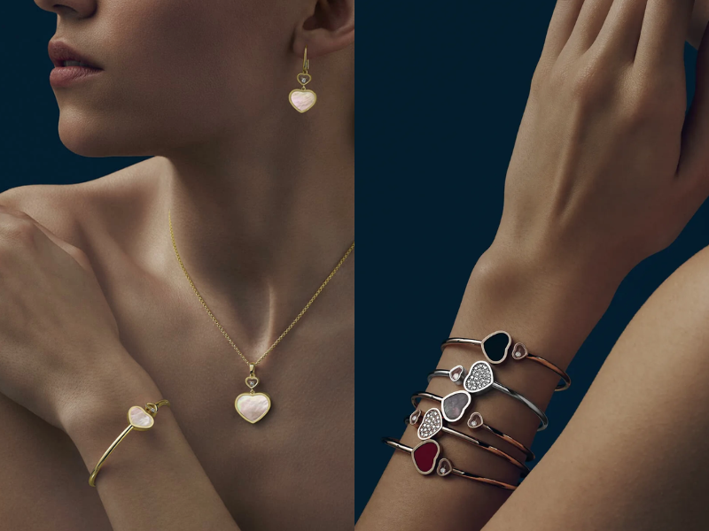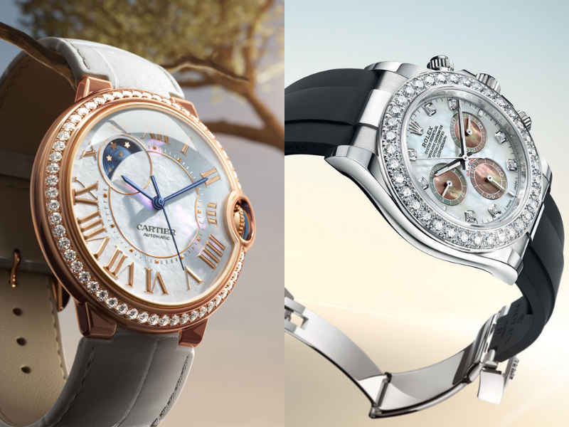 Không dừng lại ở trang sức, xà cừ còn lấn sân sang thánh đường cơ khí, trở thành lớp “áo choàng” xa hoa cho các cỗ máy thời gian của Rolex, Cartier hay Chopard. Rolex nổi tiếng với quy trình tuyển chọn vật liệu khắt khe, chỉ sử dụng xà cừ tự nhiên để tạo ra các mặt số Datejust đa sắc. Nhờ vậy, ánh sáng có thể biến chuyển từ sắc hồng tinh khôi sang xanh lục huyền ảo chỉ qua một cái lắc tay. Với Cartier và Chopard, xà cừ là lớp nền tạo độ sâu cho đồng hồ. Nếu Cartier ưu tiên sự tối giản tinh tế để tạo nên vẻ đẹp tinh giản, thì Chopard lại sử dụng sự tĩnh lặng của xà cừ làm phông nền cho những viên kim cương nhảy múa tự do trong dòng Happy Hearts. Chính sự tương phản giữa cái tĩnh của đá và cái động của ánh sáng xà cừ đã tạo nên một bản giao hưởng nghệ thuật đầy cảm xúc.