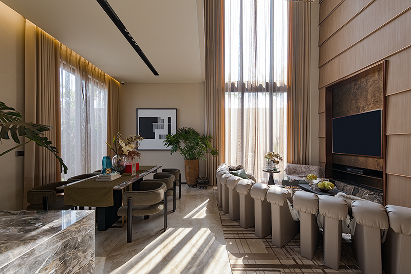Căn Twin Villa được họa nên dành cho những gia chủ tìm kiếm sự riêng tư nhưng vẫn trân quý những phút giây kết nối đồng điệu. Chính vì vậy, không gian phòng khách trở thành điểm nhấn với khoảng thông tầng ấn tượng lên tới 6,7m, cùng mảng kính lớn mở ra tầm nhìn hướng sân vườn xanh mát, mời gọi ánh sáng tự nhiên hòa điệu với nhịp sống thường nhật.