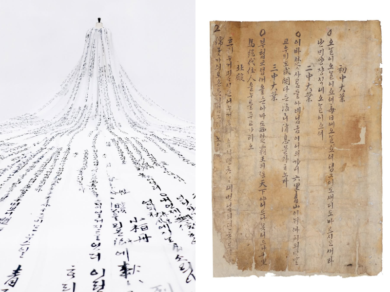 Trong không gian sân khấu tối, những chiếc tà áo dài gần 15 mét buông xuống. Bề mặt vải lụa trắng in những câu chữ trích từ “Cheonggu Yeongeon”, tuyển tập thơ ca đầu tiên được ghi chép bằng Hangeul. Trong khi đó, tấm mạng che mặt ngụ ý khoảnh khắc đối diện với cội nguồn và bản sắc một cách tĩnh tâm nhất. Khi lớp vải được vén lên, Hangeul hiện ra như ngôn ngữ đã gọi tên cô từ thuở đầu, đồng thời để lại dấu vết rõ ràng về nơi cô bắt đầu hành trình của mình – Hàn Quốc.