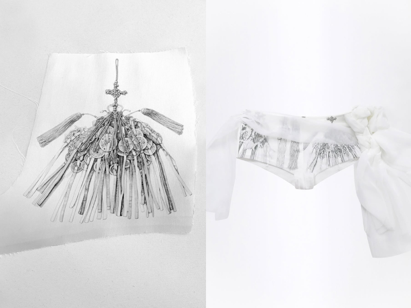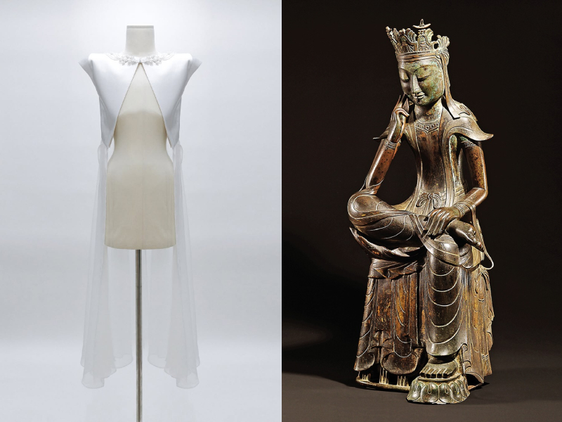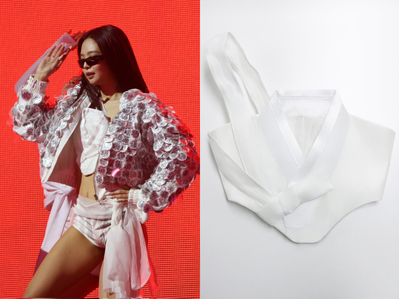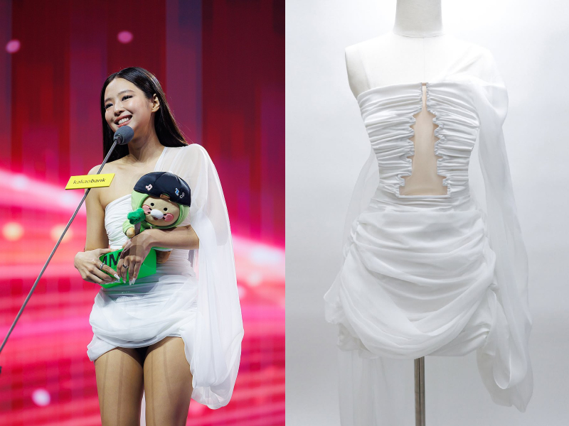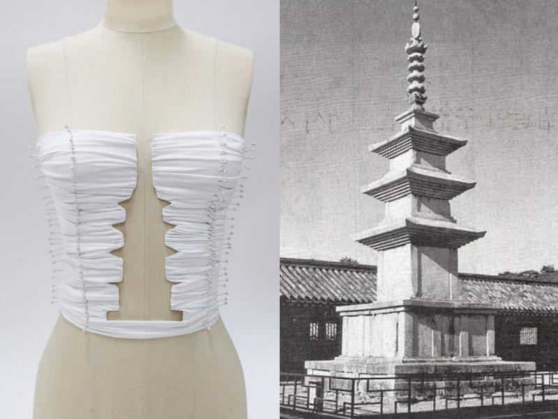 Cuối cùng, chiếc đầm Jennie mặc khi nhận giải “Record of the Year” được phát triển từ bố cục của tháp đá Seokgatap tại Bulguksa. Các chi tiết cắt xẻ được dựng hoàn toàn bằng kỹ thuật gấp nếp thủ công, tập trung vào mối quan hệ giữa khoảng hở và cấu trúc.