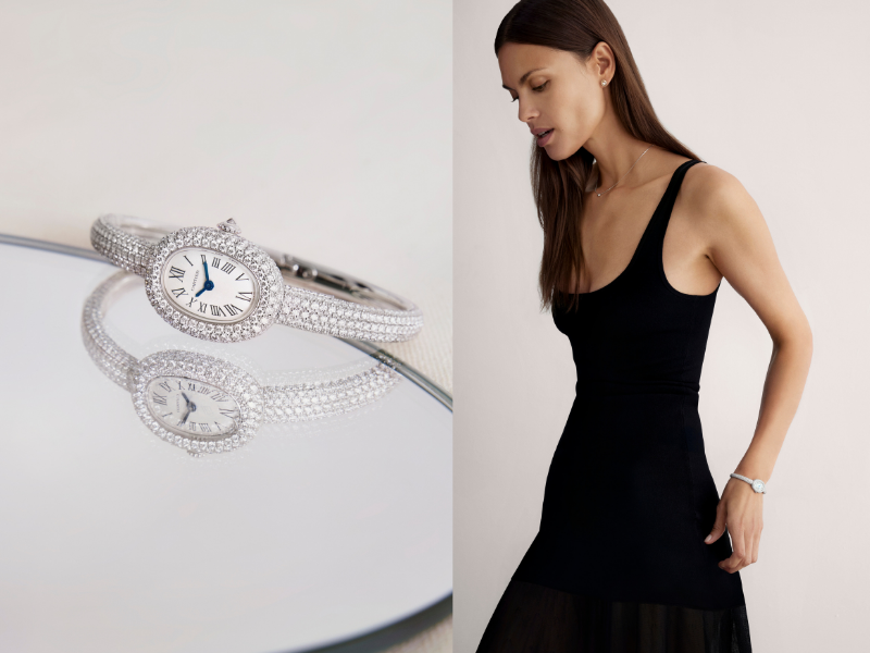 Mẫu đồng hồ Baignoire với hình dáng bầu dục kinh điển được ra mắt cách đây ba năm, trở lại trong diện mạo của một chiếc vòng nạm 552 viên kim cương, trong đó có 380 viên kim cương cắt giác brilliant trên phần vòng tay cong, 171 viên kim cương trên vỏ đồng hồ hình bầu dục và 1 viên kim cương đơn được nạm trên núm vặn. Ánh sáng len vào mặt kính sapphire dạng vòm, mặt số hiển thị nền màu bạc hạt mịn phía sau các chữ số La Mã màu xám than, và ánh kim thép xanh hình kiếm uyển chuyển đánh dấu thời gian trong một quầng xanh dịu. 8 giờ nạm đá là khoảng thời gian người thợ phải “lắng nghe” chiếc đồng hồ, để kim cương nằm yên đúng vị trí, hòa nhập vào hình thể vốn đã rất mềm mại.