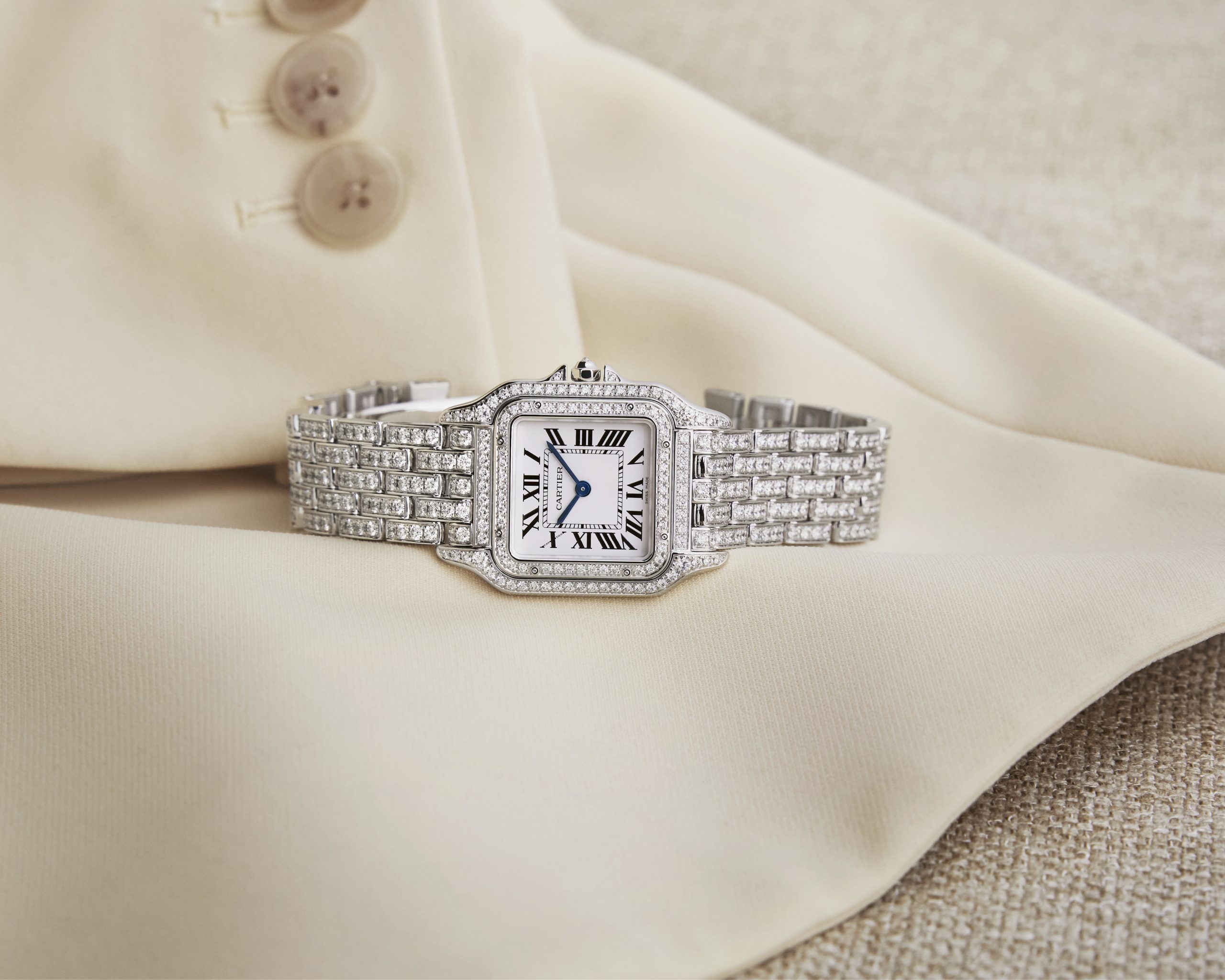 Trong khi đó, Tank Américaine và Panthère được Cartier tái sinh theo cách khác nhau nhưng cùng chung một tinh thần: đưa những khối đá vào nơi từng thuộc về các chi tiết cơ khí. Phiên bản Tank Américaine cực nhỏ được nạm 569 viên kim cương, mặt số chải satin ánh bạc cùng với vạch phút dạng đường ray với góc bo tròn, kim thép xanh hình kiếm và núm vặn được nạm một viên kim cương cắt giác brilliant. Dây đeo liền mạch làm chiếc đồng hồ trở thành một đường chảy ánh sáng ôm lấy cổ tay.