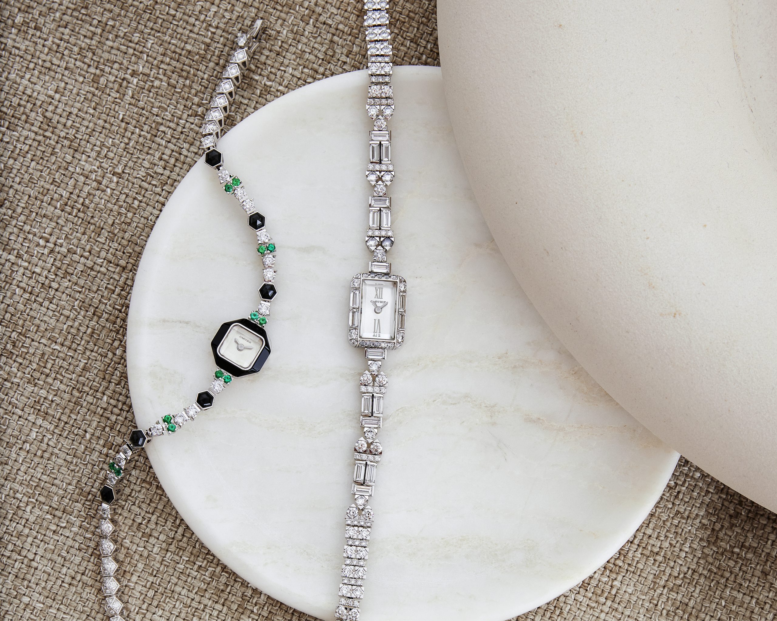 Cartier còn đưa trở lại cặp màu đen – xanh lục nhờ onyx và ngọc lục bảo. Ở một mẫu đồng hồ, những viên onyx được mài phẳng và sắp đặt quanh vành bezel, tạo nên đường viền tối sâu, tương phản với mặt số bạc tỏa tia. Sự đối lập không nhằm tạo kịch tính mà để nhấn mạnh cảm giác về chiều sâu. Một chi tiết chung của các mẫu lần này là mặt kính sapphire cắt giác cạnh, như một lời nhắc nhẹ rằng những chiếc đồng hồ này sinh ra từ mỹ cảm của những viên đá. Núm vặn biến mất và được thay bằng cơ chế ẩn để không phá vỡ đường nét.