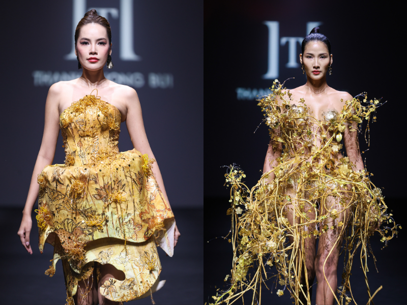 Hoa hậu Hòa bình Việt Nam 2023 Lê Hoàng Phương là người mở màn show diễn với bộ trang phục lấy ý tưởng từ chúc chỉ, trong khi Á hậu Hoàng Thùy đảm nhận vị trí vedette, diện thiết kế ấn tượng nhất BST với hàng trăm bông hoa cắt 3D, phom dáng bất quy tắc trên nền kẽm đàn hồi, được dát vàng trực tiếp lên người trong suốt 1 tiếng trước show.