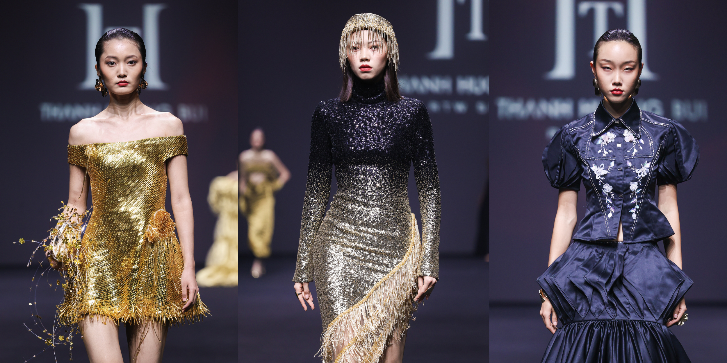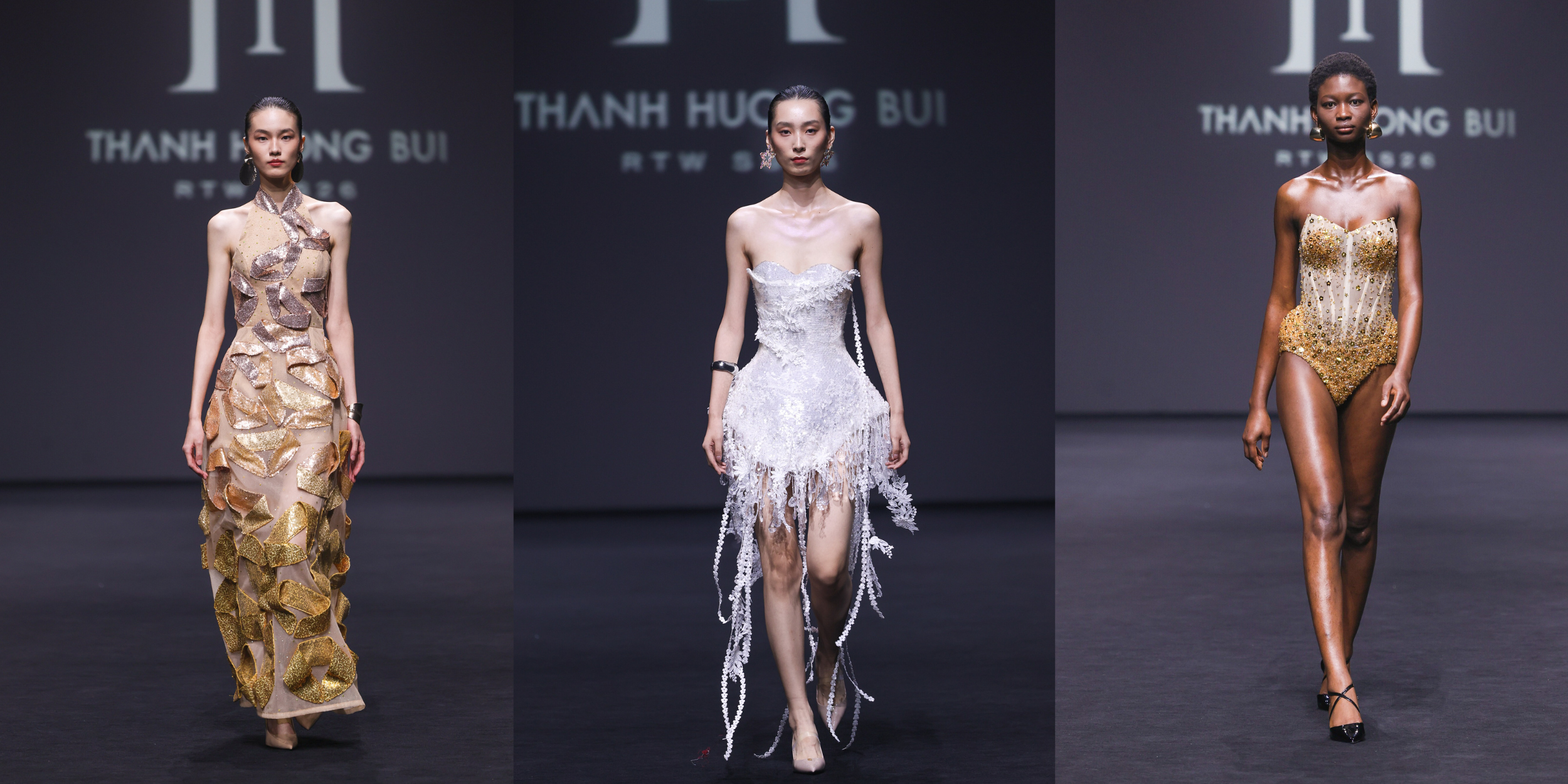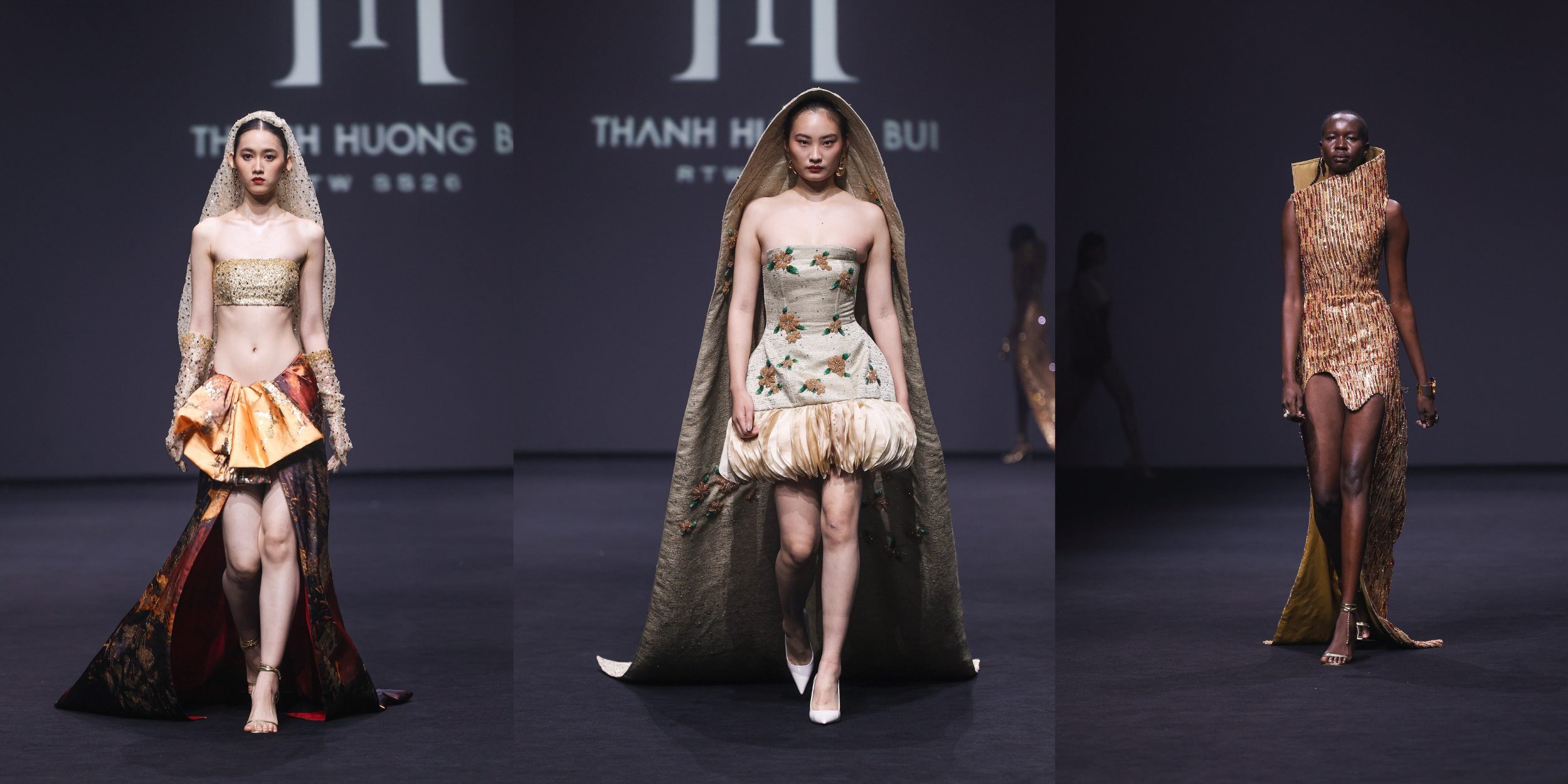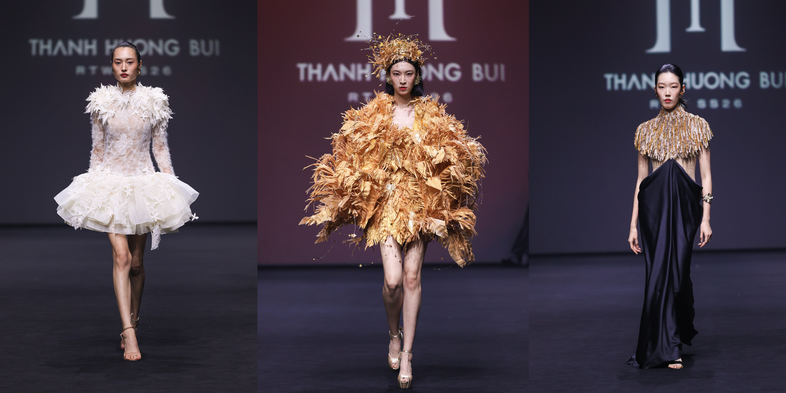 Lấy cảm hứng từ các chất liệu văn hóa dân gian như nghệ thuật chúc chỉ, kỹ thuật làm giấy truyền thống, tranh sơn mài, tre Việt và nón lá, Thanh Hương Bùi đã khéo léo kết hợp cùng kỹ thuật dựng phom 3D hiện đại, đính kết đá quý, dát vàng và cắt hoa nổi thủ công để tạo nên một bản hòa ca của truyền thống và đổi mới.