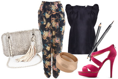 Thay vì một chiếc sơ-mi hoa bạn vẫn mặc hàng ngày, hãy thử một chiếc quần hoa với họa tiết thật lạ mắt, kết hợp với áo đơn sắc, clutch dạng hộp và vòng tay to bản.